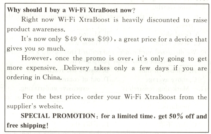 39.D 细节理解题。题干意为:人们如何能以最优惠的价格买到Wi-Fi XtraBoost?根据表格最后一行中“For the best price,order your Wi-Fi XtraBoost from the supplier’s website.”和“SPECIAL PROMOTION:for a limited time,get 50% off and free shipping!”可知,要想以最优惠的价格购买Wi-Fi XtraBoost,需要从供应商的网站上订购,并且目前有限时促销活动,可享受五折优惠以及包邮服务。故选D。