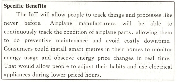 37.D 细节理解题。题干意为:根据这篇文章,下列哪一项是不正确的?根据 Specific Benefits 部分中“Airplane manufacturers will be able to continuously track the condition of airplane parts, allowing them to do preventive maintenance and avoid costly downtime. Consumers could install smart metres in their homes to monitor energy usage and observe energy price changes in real time. That would allow people to adjust their habits and use electrical appliances during lower-priced hours.”可知,物联网可以帮助人们进行预防性维护并节省资金;可以帮助人们监控能源使用情况,及时观察价格变化;可以帮助人们调整习惯,更明智地使用电器。D项“物联网可以帮助人们调查事物并更新许多重要数据”在文中未提及。故选D。