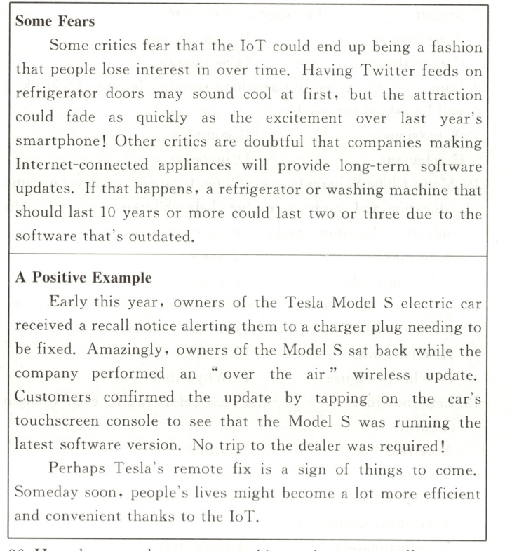 38.B 细节理解题。题干意为:除了物联网最终可能成为一种时尚之外,批评家们对于物联网还担心什么?根据 Some Fears 部分中“Other critics are doubtful that companies making Internet-connected appliances will provide long-term software updates.”可知,批评家们还担心相关的公司是否会提供长期的软件更新。故选B。