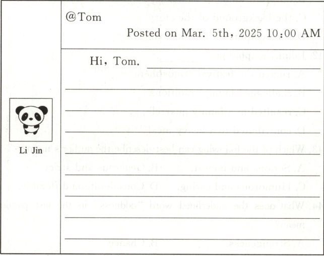 61. 假设你是晨光中学的学生李津。今年是中国春节申遗成功的第一年,国际文化交流论坛的线上社区里世界各地的网友热烈讨论中国文化。英国友人 Tom 对中国文化兴趣浓厚,他发了一个询问帖想深入了解春节之外,能体现中国文化精髓的其他非遗项目。请你在网络上进行回帖。