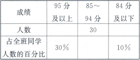 【解析】可以先求出成绩为85~94分的同学人数占全班同学人数的1 - 10% - 30% = 60%,再结合60%对应的是30人,求出该班总共有30÷60% = 50(人),那么成绩为95分及以上的有5×30% = 15(人),成绩为84分及以下的有5×10% = 5(人)。