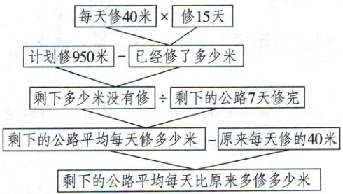 (3)根据剩下多少米公路没有修和剩下的公路7天修完可以求出剩下的公路平均每天修多少米,再减去原来每天修的40米,就可以求出剩下的公路平均每天比原来多修多少米。用思维导图表示如下: