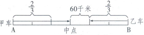 例2 甲、乙两车分别从A,B两地同时相对开出,5小时后甲车到达中点,乙车距离中点还有60千米。已知乙车的速度是甲车的$\frac{2}{3}$,求A,B两地相距多少千米。