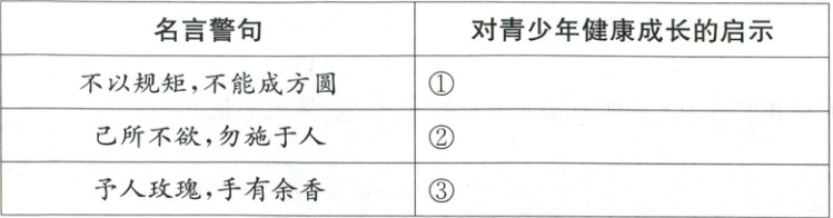 (1)阅读表中的名言警句,运用所学知识,写出其对青少年健康成长的启示。(4分,任选两处作答)