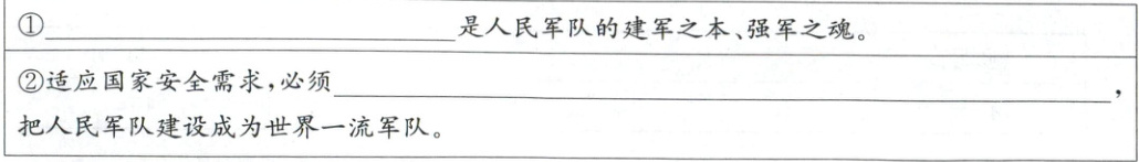 (2)①面对国家安全环境的深刻变化,面对强国强军的时代要求,必须全面贯彻习近平强军思想,贯彻新时代军事战略方针;②中华人民共和国的武装力量的任务是巩固国防,抵抗侵略,保卫祖国;③人民军队是中国特色社会主义的坚强柱石;④适应国家安全需求,我国要全面推进国防和军队现代化。