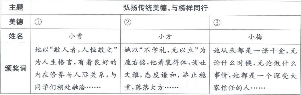 (1)三位同学的颁奖词中,分别包含了哪些美德?请你将表格补充完整。(3分)