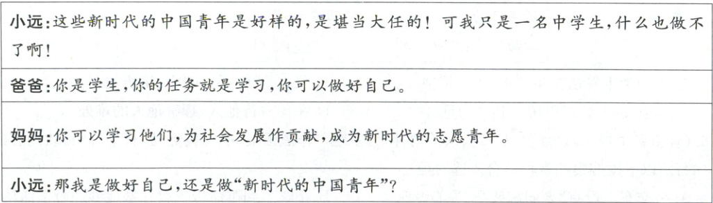 对于上述“新时代的中国青年”的志愿行为, 小远和爸爸妈妈进行了讨论。