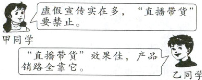 8.两位同学的观点错误。①“直播带货”宣传了各地农产品的特色,拓宽了农产品的销售渠道,促进了农业发展,所以不应盲目禁止“直播带货”,但必须要整治虚假宣传行为,维护消费者的合法权益。②尽管“直播带货”的效果好,但是要保证产品销路稳定和“直播带货”的长远发展,必须要始终坚持诚信经营,保证产品的质量。