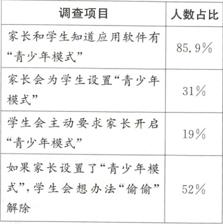 同学们就“青少年模式”在本校同学中的应用情况进行了问卷调查。以下是他们的调查数据统计: