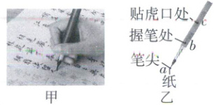 7. 新趋势 模型建构 中国书法艺术博大精深、源远流长,是中国文化的重要组成部分。如图甲,用新款钢笔式毛笔临摹字帖书法时,毛笔相当于一个杠杆,其简化示意图如图乙所示。下列说法正确的是(