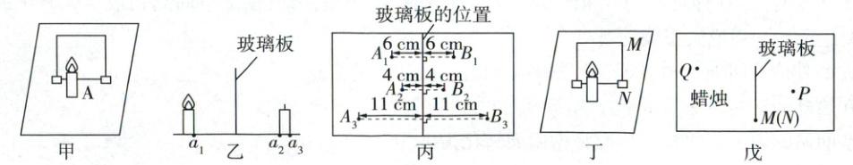 (5)蜡烛移动到题图戊中Q点,要使此时蜡烛的像的位置仍在P点,有以下操作步骤:先将玻璃板以竖直边MN为轴顺时针转动一定角度(小于90°),使得玻璃板与像与物的连线PQ垂直,此时P点到玻璃板的距离小于Q点到玻璃板的距离,由平面镜成像特点可知,若要使蜡烛的像的位置仍在P点,应向Q点移动玻璃板以减小Q点到玻璃板的距离,同时增大P点到玻璃板的距离。
