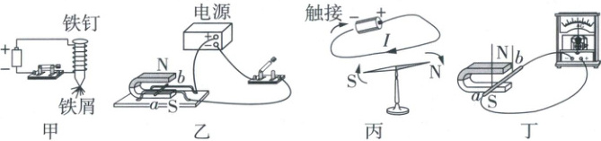 D.丁图:导体棒在磁场中竖直上下运动,电流表的指针会左右摆动