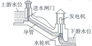 10.人类文明,一脉相传,从远古的水磨,到今天的水电站,都是人类对水能的合理开发与利用。如图是利用水能发电的示意图,人们在上游修建拦河大坝提高水位,需要发电时,打开进水闸门,水顺着导管急速流下冲击水轮机,带动发电机发电。下列相关说法