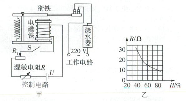 27.(9分)小亮利用湿敏电阻为社区设计了一个自动浇水器,其工作原理如图甲所示。工作电路中安装有一个"220V 22W"的浇水器,控制电路中电源电压U恒为6V,滑动变阻器R₁的规格是"100Ω 1A",在一定范围内,湿敏电阻R的阻值随土壤湿度H变化的关系如图乙所示。电磁铁线圈的电阻忽略不计,当土壤湿度增加至40%时,控制电路中的电流为0.06A,浇水器恰好停止工作。