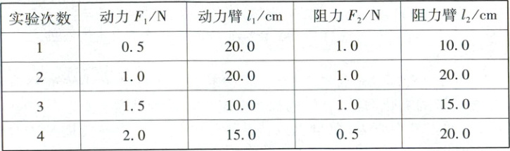 。(3)在杠杆两侧挂上钩码,设右侧钩码对杠杆施加的力为动力F₁,左侧钩码对杠杆施加的力为阻力F₂,测出杠杆平衡时的动力臂l₁和阻力臂l₂;多次换用不同数量的钩码,并改变钩码在杠杆上的位置,得到实验数据如下表: