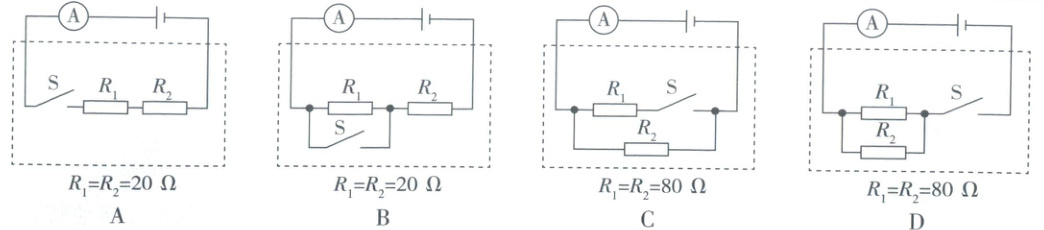 10. 在如图所示的虚线框内连接一个开关$S$和两个阻值相同的定值电阻$R_{1}$、$R_{2}$。当$S$断开后,电流表数减小$0.2A$,整个电路消耗的电功率减小$1.6W$。下列选项中,电路连接情况和$R_{1}$、$R_{2}$阻值