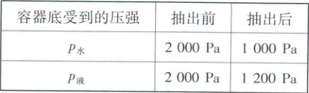 15. 两个相同的薄壁圆柱形容器置于水平桌面上,一个装有$4kg$的水,另一个装有某种液体。分别从两容器中抽出相同体积的水和该液体,抽出前后水和该液体对容器底的压强如表所示。则该液体抽出前的质量为
