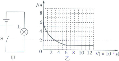 16. 将标有“$6V\ 6W$”的灯泡$L$接入电源电压恒为$6V$的电路中,如图甲所示。闭合开关,利用传感装置绘制出通过灯泡$L$的电流随时间变化的图像如图乙所示。闭合开关瞬间,灯泡的电功率为