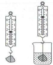21. 如图所示,将一石块悬挂在弹簧测力计下,静止时弹簧测力计示数为$2.5N$;将该石块浸没在装有适量水的烧杯中,静止时弹簧测力计示数为$1.5N$。求:$(\rho_{水}=1.0×10^{3}kg/m^{3})$