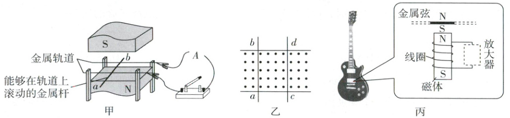。(3)电吉他中电拾音器的基本结构如图丙所示,磁体附近金属弦被磁化,因此弦振动时,在线圈中产生感应电流,感应电流经电路放大后传送到音响发出声音,则弦振动时,线圈中的感应电流方向