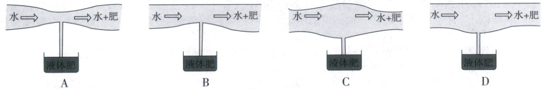 11. 小华观察发现:同一河流,狭窄处比宽阔处水流更湍急。受此启发,他结合所学物理知识,设计了四种装置吸取液体肥,用于学校劳动基地水肥一体化灌溉,各装置剖面如图所示。在左端管口横截面积和水流流速相同的情况下,下列设计中吸肥最快的是