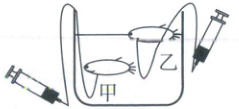 15. 小华在相同气球内装上不同配重做了两个“小鱼”,“小鱼”甲的质量大于“小鱼”乙的质量。注射器可以通过连接“小鱼”的软管对“小鱼”进行抽气和充气,从而改变“小鱼”的体积。初始时,两“小鱼”在水中处于静止状态,如图所示。忽略空气重力及软管对“小鱼”的作用,“小鱼”所受浮力分别用$ F_{甲} $、$ F_{乙} $表示,下列说法正确的是
