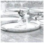 25. (6分)王莲是一种大型浮叶草本,叶片布满气室、边缘向上卷起,具有粗壮的叶脉支撑结构,植物园在其观赏期向游客开设载人体验活动。为安全起见,工作人员将一泡沫板置于叶片上方(泡沫板和叶片的面积视为相等)。如图所示,一质量为28kg的游客坐在泡沫板上进行体验。已知叶片底面积为1.4m²,其浸入水中的最大安全深度为5cm。(叶片及泡沫板质量均忽略不计,$\rho_{水}=1.0×10^3kg/m^3$,g取10N/kg)。求: