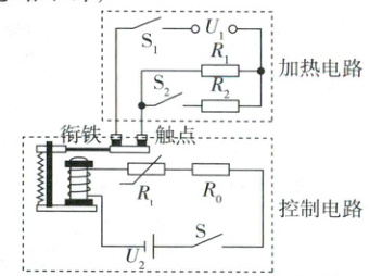 26. (7分)某电蒸锅有防干烧功能,可实现温度过高时自动停止加热。其内部由加热电路和控制电路组成,简化电路如图所示。加热电路有高、低温两个挡位,已知$U_1 = 220V$,$R_2 = 121Ω$,高温挡电功率为1500W。控制电路电压$U_2 = 6V$,$R_0 = 10Ω$,$R_t$为热敏电阻,其阻值随锅内温度的变化情况如下表所示。当电磁铁线圈中的电流达到0.15A时,衔铁吸合,触点断开,停止加热。(电磁铁线圈电阻忽略不计)