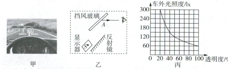 27. (7分)如图甲所示是一款智能电动汽车,装有平视显示系统(简称HUD)。它利用平面镜成像原理使显示器上的行车数据通过前挡风玻璃成像在正前方,驾驶员不必低头就可以看到车辆行驶的车速、油耗等信息,部分光路如图乙所示。车窗采用"智能玻璃",除具有单向透光功能,还可以根据车外光照度自动调节透明度(指车内光照度与车外光照度的比值)。汽车的后视镜壳、内饰门板和门把手均采用碳纤维材料制成,未来汽车排放会越"低碳",汽车本身则会越"高碳"。