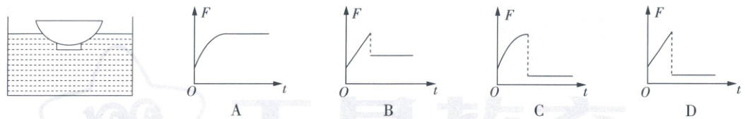 10. 如图所示,小明洗碗时发现,向漂浮在水面上的碗中加水,碗浸入水的深度越来越大,当水量增加到一定程度时,碗浸没水中,直至沉底。假如碗里水的质量是缓慢均匀增加的,则下列关于碗受到的浮力随时间变化规律的图像可能是(