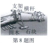 8. 如图所示为我国古人运送巨木的劳动情境示意图。他们通过横杆、支架、石块等将巨木一端抬起,垫上圆木,以便将其移到其他地方。下列有关说法正确的是(