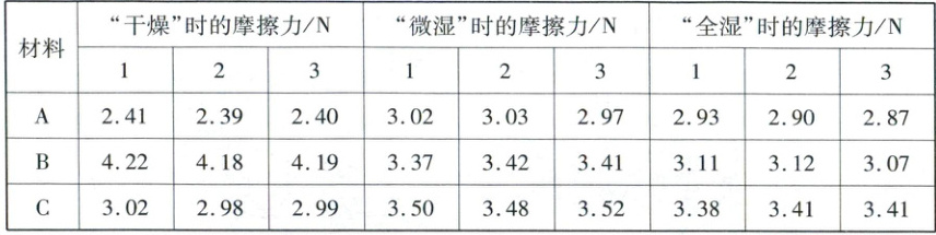 (2)在“微湿”状态下,鞋子在哪种材料上受到的滑动摩擦力最小?