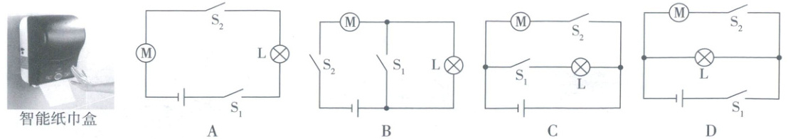 闭合开关S₁,电源指示灯L亮,然后手进入感应区时开关S₂闭合,电动机M转动送纸→指示灯与电动机可以单独工作,二者并联(排除选项A、B)