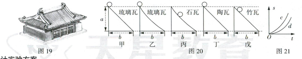 (1)研究雨滴经过屋顶的时间与屋顶材料的关系,需要控制实验初始位置、屋顶形状相同,屋顶材料不同,由题图20可知应选甲和丁进行研究。由题图21可知,相同时间图像c对应的钢珠运动的路程大,则钢珠运动的平均速度较大;题图21中图像c通过的路程长,代表的是题图乙中钢珠滑下的情况,而图像c对应的s最大时的t短,说明钢珠滑过屋顶乙的时间较短。