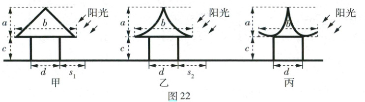 (3)由于光沿直线传播,根据题图22中屋顶的形状,甲、乙被屋顶挡住的光线较多,丙的屋檐上翘,挡住的光线较少,所以丙建筑阳光能够照射到房间内距离最远。