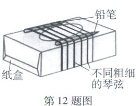 12. 如图所示,某兴趣小组在跨学科实践活动中使用粗细不同的皮筋制作了简易弦琴,若用大小相同的力拨动琴弦,会发出