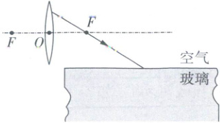 【解题思路】平行于主光轴的光经过凸透镜后,折射光线通过焦点,由此可知入射光线与主光轴平行;之后,光线从空气斜射入玻璃砖中,其折射光线将向法线方向偏折,折射角小于入射角。