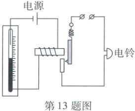 13. 如图所示是一种温度自动控制装置的原理图。当温度达到金属丝下端所指的温度时,电磁铁会产生磁性,它的N极在