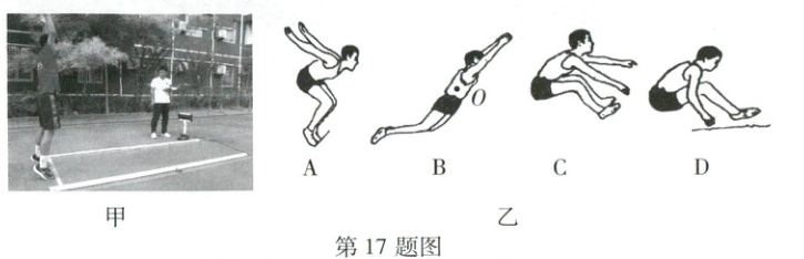 17. 如图甲所示是中学生进行立定跳远测试的情形, 其中蕴含了丰富的物理知识: