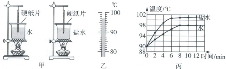20. (7 分) 探究“液体在沸腾前后温度变化的特点” 的实验装置如图甲所示。取质量相等的水和盐水分 别放入两个相同的烧杯中, 用相同的酒精灯同时加热, 根据实验数据, 绘制温度随时间变化的图像 如图丙所示。