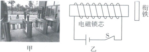 19. 如图甲所示, 很多场所大门都安装了电磁门禁系统。其内部基本结构如图乙所示, 主要由电磁锁芯和衔铁组成, 通电后二者紧紧相吸, 起到闭门的效果。电源开关闭合后, 电磁锁芯的右端是