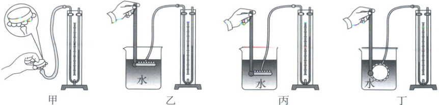 (1) 使用前应检查装置的气密性, 方法如图甲所示: 用手轻轻按压几下橡皮膜, 发现 U 形管中的液面保持相平, 原因是漏气的 U 形管