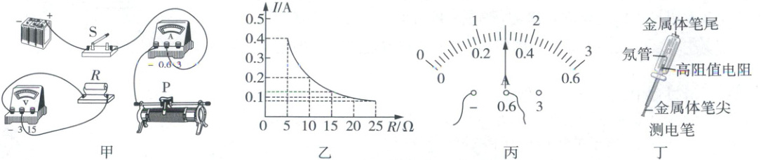 _ 。(4) 请依据以上结论, 解释图丁所示测电笔内高阻值电阻的作用: