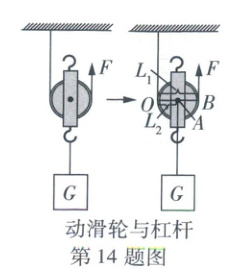 14.如图,不计绳重、动滑轮重和摩擦,关于动滑轮的特点及其中的杠杆原理,下列说法