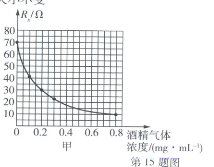 15.“饮酒不开车”是司机必须遵守的交通法规。现要利用一种二氧化锡半导体型酒精气体传感器组装一个酒精测试仪,此传感器的电阻$R_x$随酒精气体浓度的变化规律如图甲所示。图乙为测试仪的电路图,电源电压恒为$4\ V$,电压表测量范围为$0\sim3\ V$,定值电阻$R=10\ \Omega$,用于保护电路。目前国际公认的酒驾标准是“$0.2\ mg/mL\leq$酒精气体浓度$<0.8\ mg/mL$”,下列说法正确的是