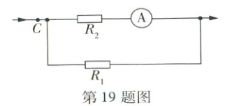 19. 如图所示的部分电路,$R_1=20\ \Omega$,$R_2=30\ \Omega$,电流表示数为$0.40\ A$。若把电流表改接在电阻$R_1$的支路中,电流表的示数为