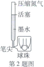 2. 如图所示的圆珠笔能在空间站中使用,笔尖里的球珠在纸上滚动时,把沾在球珠上的墨水留在纸上,封闭在笔芯中的压缩氮气推动墨水向笔尖流动,就能连续不断写出字来。如果在教室里用这种圆珠笔,写字的过程中(墨水未用完)笔中压缩氮气的 (