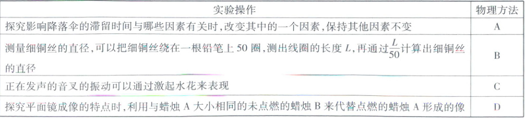 6. 新考法 知识梳理改错 对所学的知识整理复习是良好的学习习惯,某同学对学习过的物理实验操作及其中的物理方法进行如下梳理,下表中对应位置填写