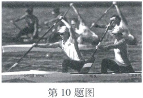 10. 在巴黎奥运会皮划艇静水女子 500 米双人划艇决赛中,中国皮划艇队卫冕成功。如图,是两名运动员在比赛中奋力划桨的情景。下列说法正确的是 (