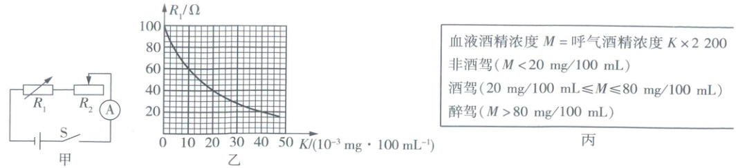 12. 司机酒后驾驶存在许多安全隐患。某物理兴趣小组设计了一种简易酒精气体浓度检测仪,其电路原理图如图甲所示。R₁是气敏电阻,其阻值随呼气酒精浓度 K 变化的关系如图乙所示,R₂为滑动变阻器,检测前通过调节滑动变阻器对检测仪进行“调零”,此时电流表的示数为 0.1 A,调零后滑动变阻器滑片的位置不变,电源电压为 12 V 并且保持不变,查阅到的相关资料如图丙所示。下列说法中正确的是 (